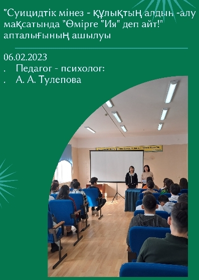 06.02. күні колледж студенттеріне «Суйцидтік мінез - құлықтың алдын - алу мақсатында «Өмірге «Иә» деп айт!» апталықтың іс - шаралар жоспары таныстырылды. ...