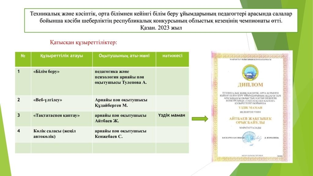 9 желтоқсан 2025 Астана қаласында өткен Х WorldSkills Kazakhstan-2025 республикалық кәсіби шеберлік чемпионатына студенттерді дайындап, тартысты додада шеберліктерін шыңдап, жеңіске қол жеткізген қатысушылардың жетістігіне жетекшілері мен білікті мамандарымыздың еңбегі зор. Ары қарай оқу