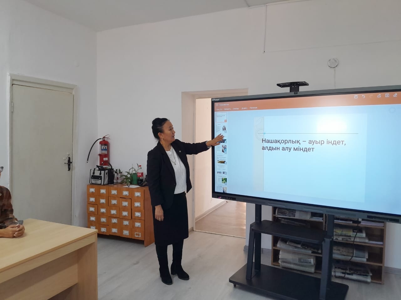 Ағымдағы жылдың 14 қараша күні "Адалдық- асыл қасиет" тақырыбында кітапханашы Ж.К.Догдырбаева колледж студенттеріне кітап көрмесін өткізді. Мақсаты: Қоғамның әртүрлі орталарындағы сыбайлас жемқорлықтың алдын алу, профилактикалық жұмыстарын насихаттау; сыбайлас...